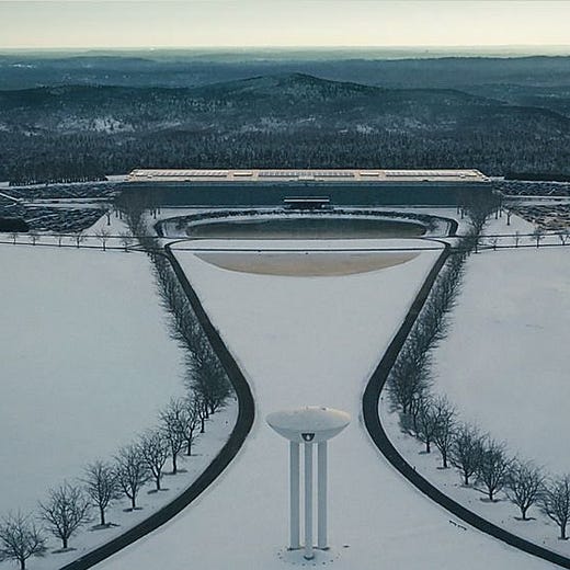 Everything is symmetrical, to mimic the split lives the characters are living. The lights are entirely white and cold everywhere mimicking office light, except for the main character’s Mark sister's house. It seems to be also the only place he feels well.